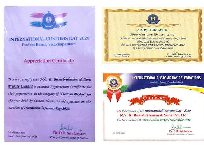 We have been awarded BEST CHA by Visakhapatnam Custom House consequently for years 2017, 2018 and 2019.